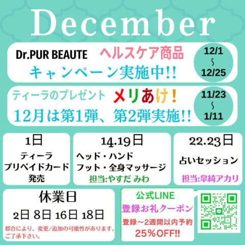 お知らせキャンペーン情報皆様こんにちは、 吉祥寺 肩甲骨専門エステ ティーラ 菊地です。 もう12月ですね。。。。。。年々まったく師走感が感じられないのはわたしだけでしょうか。...