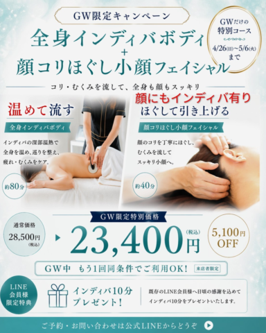 お知らせキャンペーン情報皆さまこんにちは、吉祥寺 ティーラ菊地です。 GW限定コースの詳細はこちらです。 BODYインディバ40分・リンパマッサージ40分※インディバをあてる箇所、マッ...